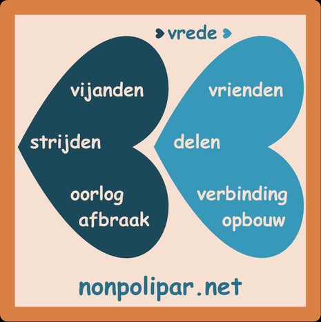 Sinds jaar en dag staan oorlog en vrede tegenover elkaar. Nonpolipar breekt met die klassieke tegenstelling. Want dat we eraan gewend zijn, wil nog niet zeggen dat het klopt. Oorlog dicteert, beschadigt, ontneemt. In vredestijd gebeurt dat gelukkig veel minder, of zelfs helemaal niet. Maar daarmee hebben we nog niet de tegenstelling te pakken. Want dan zou er in plaats van dicteren sprake moeten zijn van overleggen. In plaats van beschadigen, zouden partijen elkaar moeten helpen. En in plaats van nemen zou geven op het programma moeten staan. Nonpolipar brengt dit samen onder de noemer 'delen'. Tegenover de staat van oorlog zet nonpolipar de daad van delen. Daar tussenin ligt het neutrale middengebied van de vrede: een toestand van leven en laten leven. Maar in de visie van nonpolipar zouden we niet moeten (be)rusten in vrede. Want in vredestijd kan het nog alle kanten opgaan. In vrede leven is goed; in vrede delen is beter.